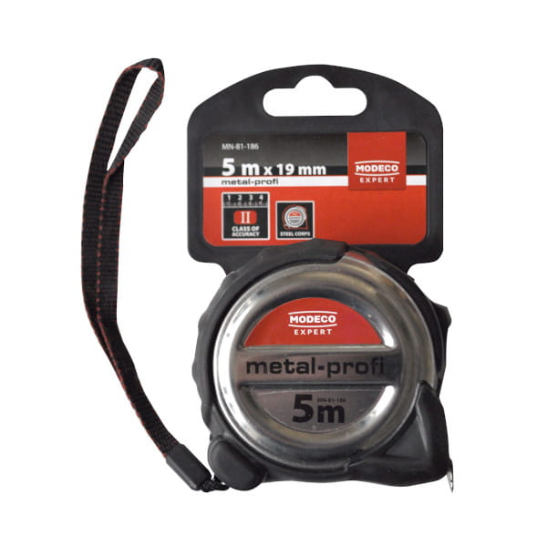 Miara spełnia warunki norm UE wg II klasy dokładności (błąd pomiarowy może wynosić +/-0,7mm na 2 m). Metalowy korpus dodatkowo gumowany zapewnia maksymalną odporność na wstrząsy. Taśma miernicza w kolorze białym jest dobrze widoczna podczas pomiarów Specjalna dodatkowa powłoka na taśmie przedłuża jej żywotność i redukuje możliwość jej ścierania. Trzy nity mocujące zaczep mierniczy trwale i pewnie łączą zaczep z taśmą. Miara MN-81-185 posiada magnes.