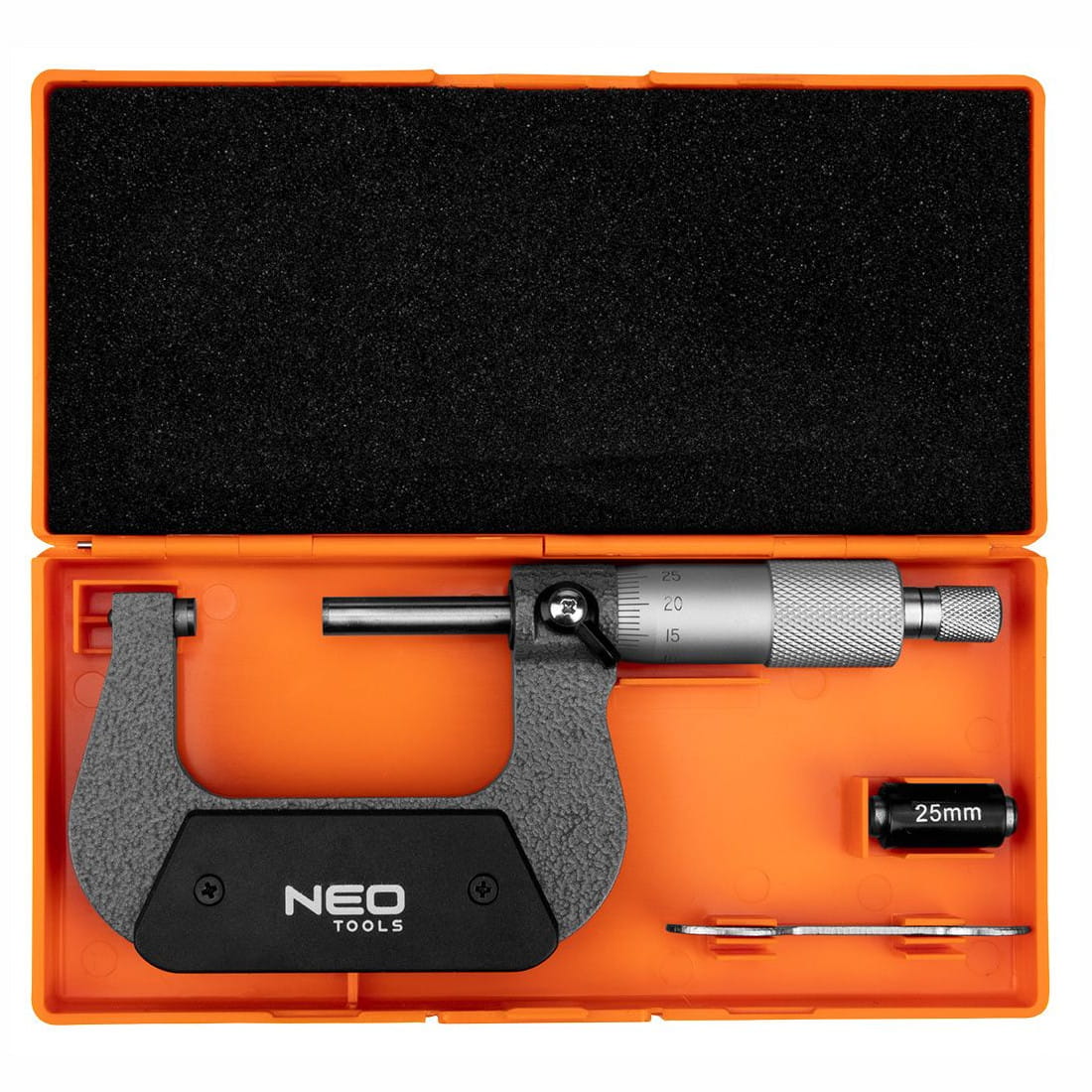 Zestaw składa się na mikrometr noniuszowy marki NEO, wzorzec, praktyczny kluczyk do zerowania oraz pudełko z tworzywa.