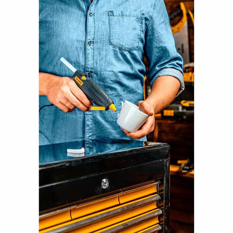 Wydajność kleju 12 g/min. Idealny do warsztatu majsterkowicza, jak i do profesjonalnych zastosowań, takich jak mocowanie wykładzin, produkcja mebli.