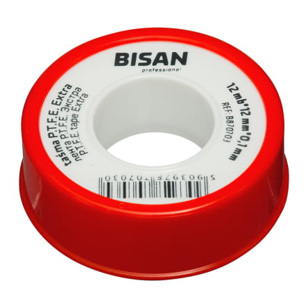 Taśma teflonowa do uszczelniania połączeń gwintowych w instalacjach wodnych (metalowych i z tworzyw sztucznych). Przeznaczona do średnic < 1". Wytrzymuje temperatury od -260°C do 260°C i ciśnienie do 15 barów. Grubość 0,10 mm; gęstość 0,35 g/cm3; szerokość 12mm; długość 12mb.